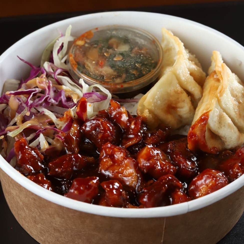 Pedaços de frango desossados caramelizados no molho kpop com arroz, mandu, salada e kimchi de pepino.