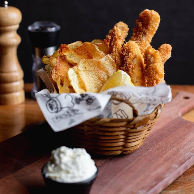 Tiras de filet de tilápia temperados com sal de aipo e limão siciliano, empanadas na panko e fritas até ficarem bem crocantes. Servidas com chips de batata doce e sour cream. Contém glúten e lactose.
