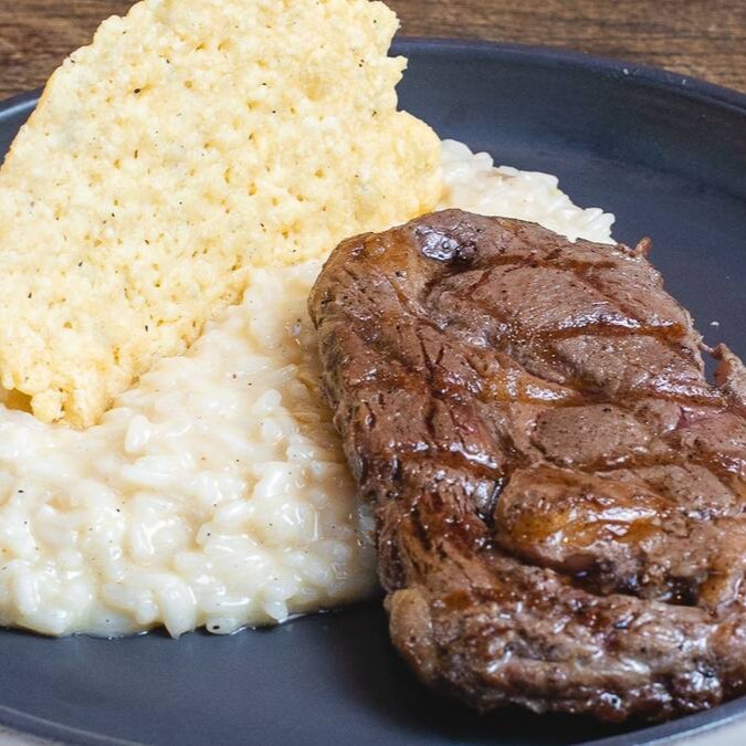 Experimente o sabor incomparável do nosso exclusivo steak ancho maturado, grelhado na manteiga clarificada e acompanhado de risoto de queijo parmesão cremoso e crocante. Contém lactose.