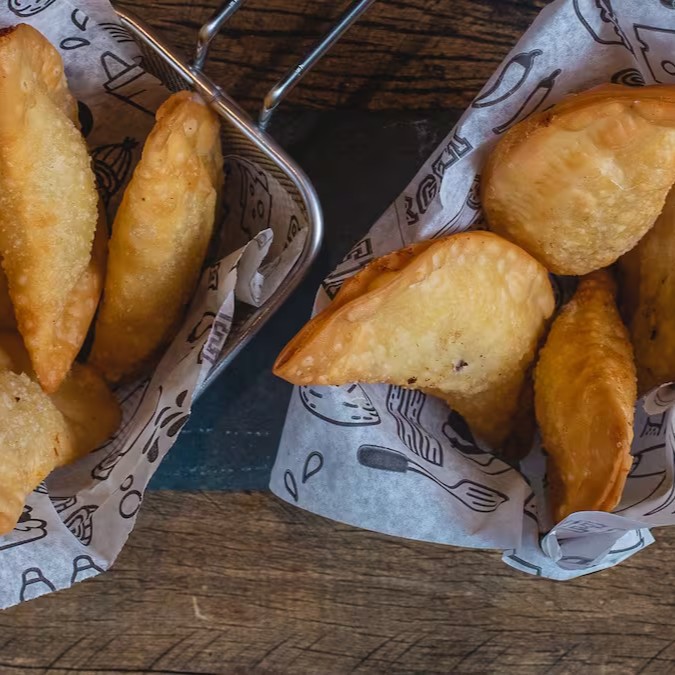 Porção com Seis pastéis crocantes e sequinhos, recheados com queijo canastra cremoso. Contém glúten e lactose.