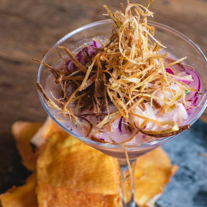 Autêntico ceviche peruano de tilápia marinada em suco de limão taiti e siciliano, cebola roxa, salsa verde, pimenta rosa e crispy de alho poró. Acompanha chips de batata doce. Contém gluten.