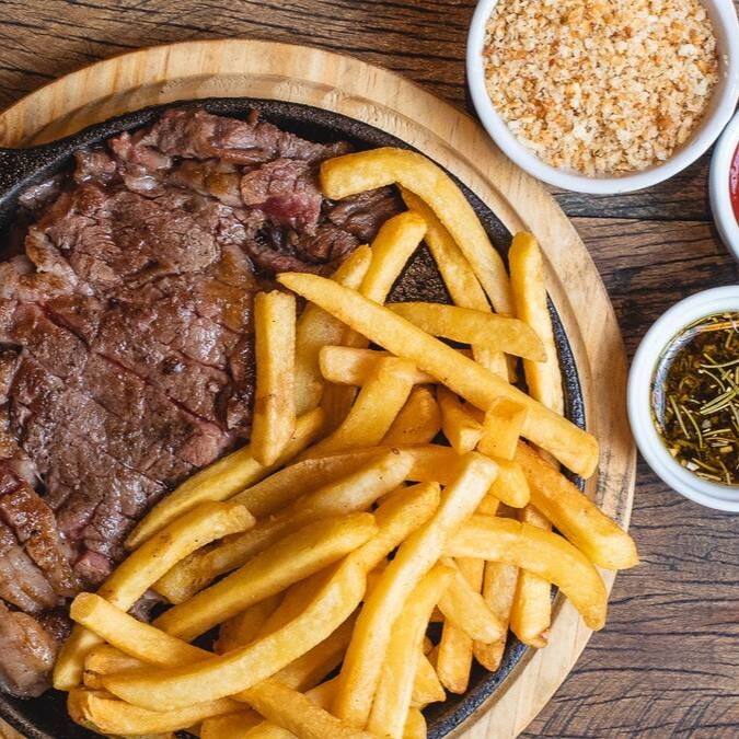 Delicioso steak ancho grelhado em manteiga clarificada com um tempero exclusivo. Acompanhado por batatas frita crocantes,