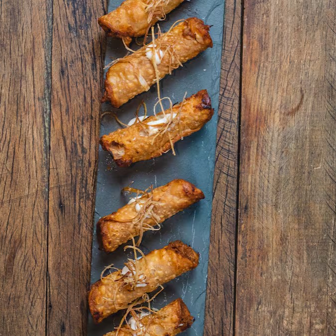 Quatro canudinhos crocantes recheados com suculenta barriga suína desfiada, envolvidos em nosso autêntico molho Barbecue Jack.