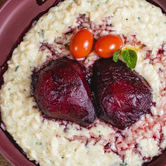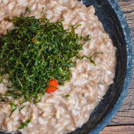 Risoto cremoso de queijo canastra ao vinho tinto, finalizado com