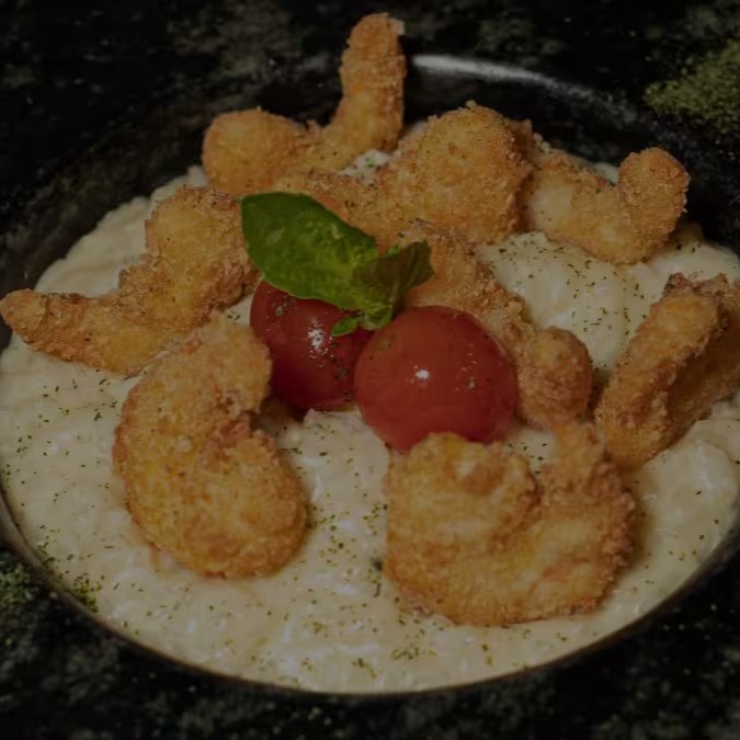 Risoto de canastra e Gorgonzola, finalizado com camarões empanados em farinha panko para uma textura crocante e irresistível. Contém glúten e lactose.