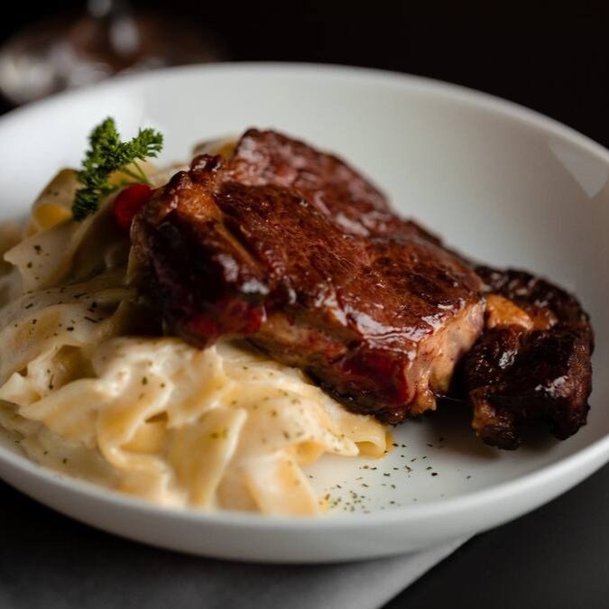 Steak Ancho, perfeitamente grelhado na manteiga clarificada e servido sobre fettuccine artesanal ao creme de queijos gorgonzola e canastra cremoso e encorpado. Contém glúten e lactose.