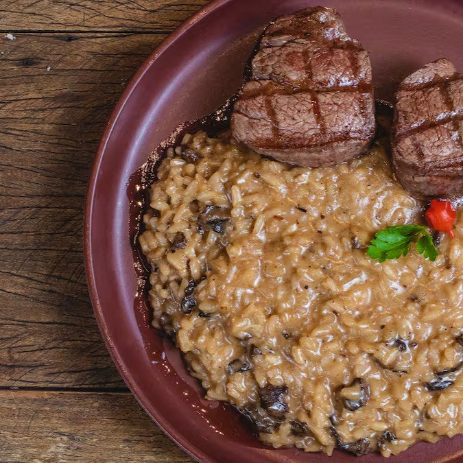 Combinação perfeita de Tiras de filet mignon perfeitamente grelhados na manteiga clarificada e acompanhados de risoto cremoso de cogumelo funghi e queijo parmesão. Contém lactose.