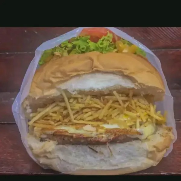 Pão, hambúrguer de boi (não artesanal), bacon, milho, mussarela, ovo, molho da casa, alface, tomate e batata palha