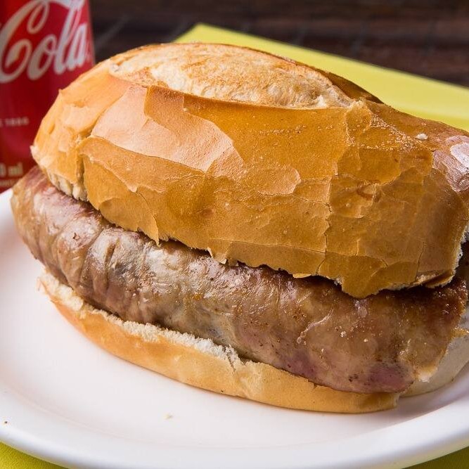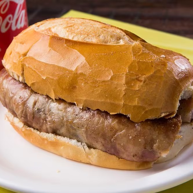 Pao frances e 2 pedaços de linguiça de porco caseira.