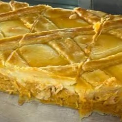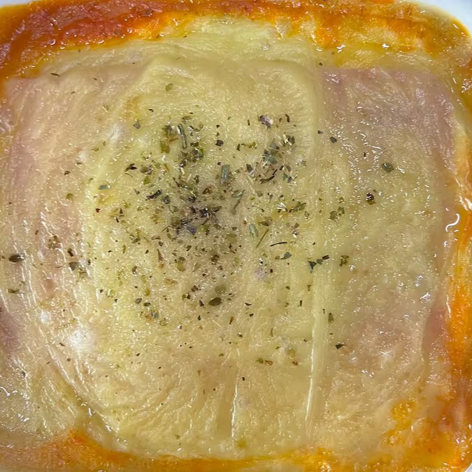 Presunto, mussarela, molho branco e molho a bolonhesa.