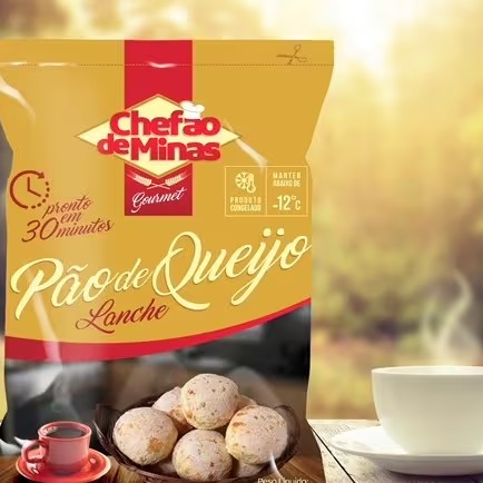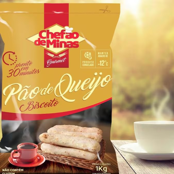 Pão de queijo congelado, tamanho grande. Aproximadamente 14 unidades no pacote de 1kg.