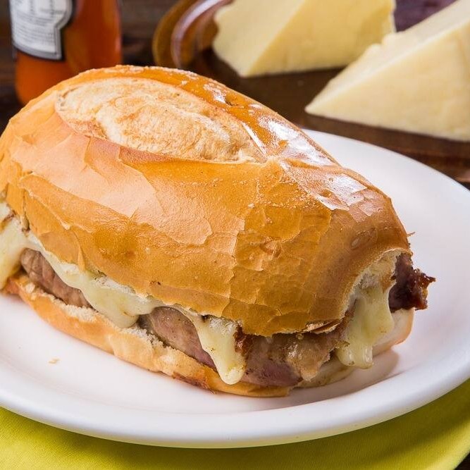 Pão frances, 02 pedaços de linguiça e requeijão.