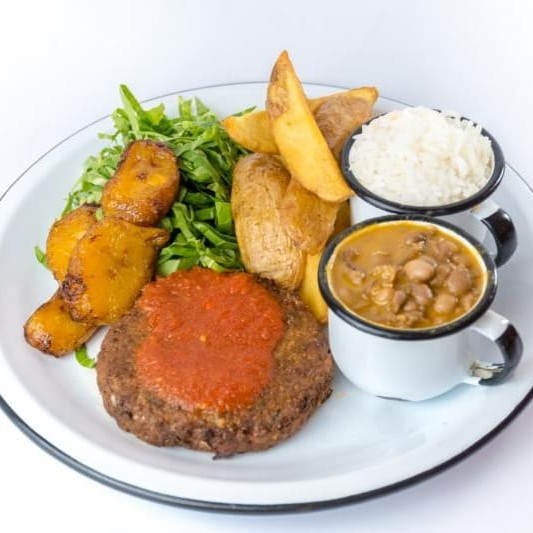 Arroz soltinho, feijão carioca caldoso, hambúrguer de grão-de-bico com molho de tomates frescos, Chips de batata doce, banana da terra e couve crua. *** Não trocamos e nem retiramos ingredientes dos nossos pratos! ***