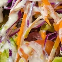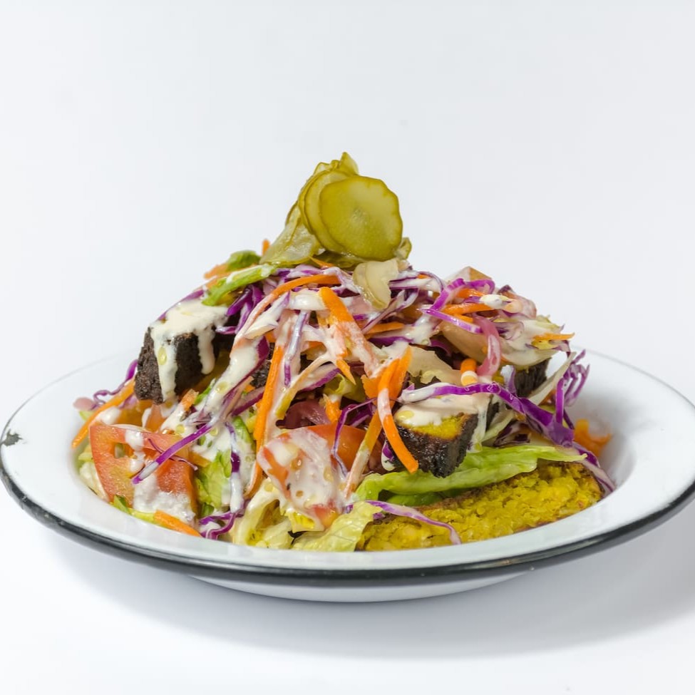 Salada de vegetais, picles, alface americana, rúcula, falafel em tiras, limão, flor de sal e molho de tofu. ***Não trocamos e nem retiramos ingredientes do prato***