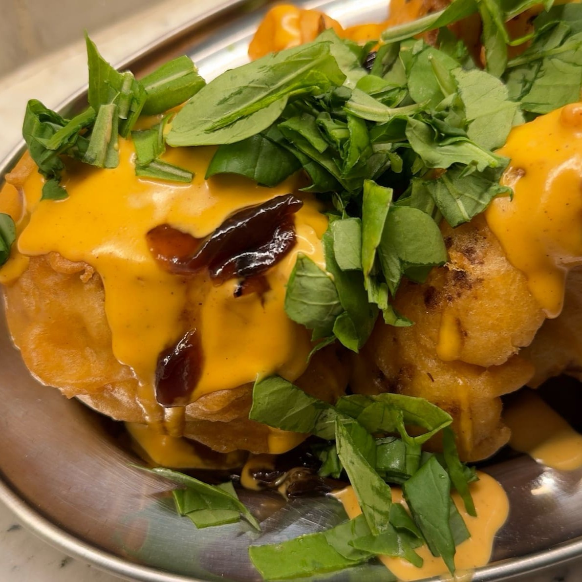 Tempurá de couve flor crocante e molho de missô e gengibre finalizado com cebola caramelizada e rúcula picadinha.