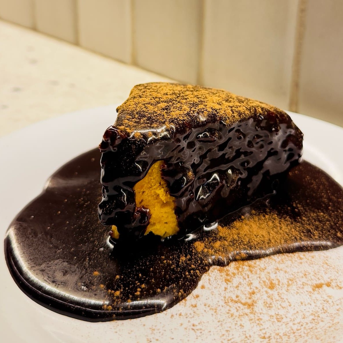 Bolo de cenoura molhadinho com calda de chocolate 70%.