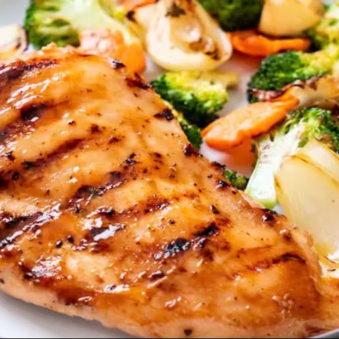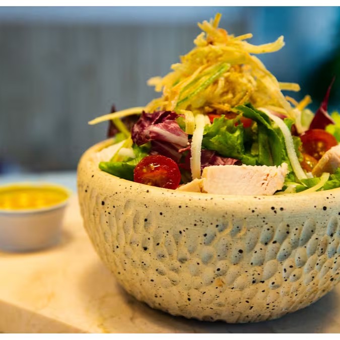 150g de filé de frango marinado, grelhado no char-broil e cortado em fatias tipo rosbife. Acompanha parmesão fresco ralado, tomate cereja e mix de folhas. Finalizada com crispy de batata doce ou de alho poró!