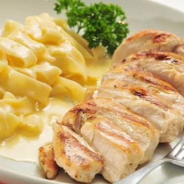 Uma deliciosa combinação do nosso fettuccine, regado ao molho alfredo (base de molho branco light, vinho e especiarias), acompanhado de peito de frango grelhado em tiras no molho roti.
