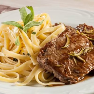 Fettuccine ao molho 03 queijos (Catupiry, gorgonzola e parmesão), com base de molho branco light, e escalopes (bifes) de filé mignon ao molho roti. Acompanha crispy de alho poró. **Servimos a carne ao ponto/ponto mais. Este é o padrão da casa. Não faremos alterações para servir mal passado**