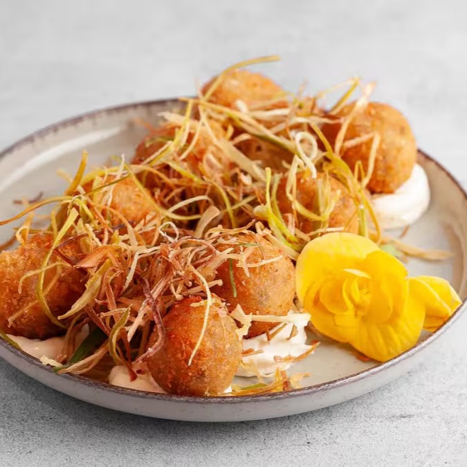 Deliciosos, quentinhos e crocantes: bolinhos de salmão grelhado, cream cheese, alho poró crocante e arroz, empanados na farinha panko.