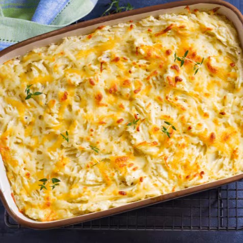 Filé de peito de frango temperado e desfiado, regado com um delicioso molho de queijos preparado sem farinha de trigo, milho batido e purê de batata (inglesa ou doce, você escolhe!). Agora finalizado com batata palha artesanal! Tudo isso gratinado a 270 graus e enviado em embalagem térmica!