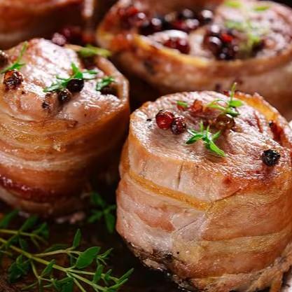 Prato inteiramente assado sem óleo! Peito de frango assado e envolto por uma fina fatia de apenas 12g de bacon (mas que da todo o sabor), servido com um toque de molho de laranja (contraste agridoce perfeito com o bacon!). Acompanha batatas ao molho branco gratinadas com mussarela fresca.