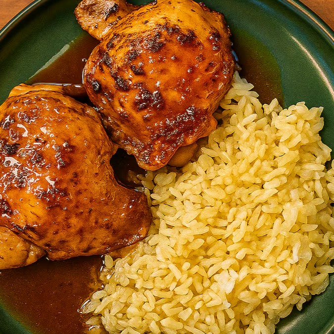 Deliciosa sobrecoxa desossada e marinada por 24h com shoyu, mel e especiarias, assada a 180 graus. Acompanha arroz cremoso e farofa artesanal de limão siciliano.