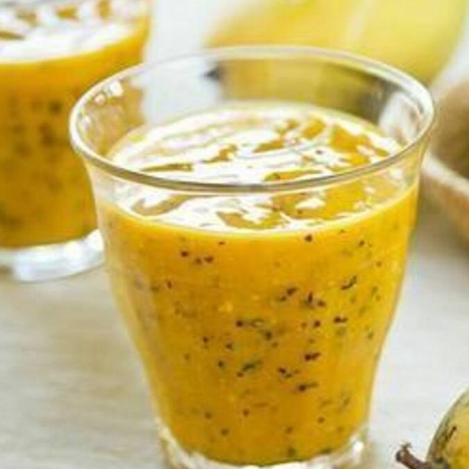 Nosso suco funcional amarelo leva: manga, maracujá e laranja.