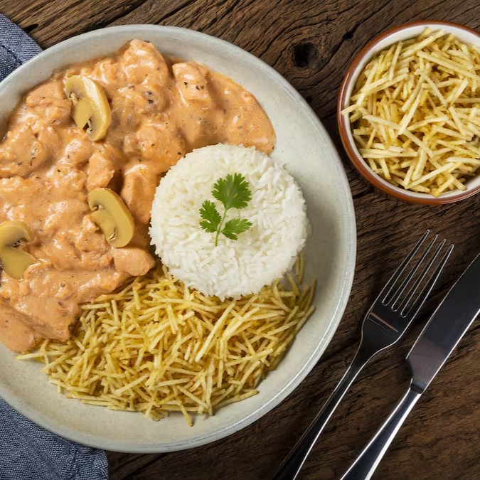 Strogonoff cremoso e saboroso de filé mignon com cogumelos laminados, acompanhado de arroz com brócolis e batata palha artesanal, preparada sem farinha de trigo