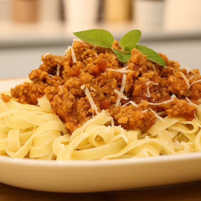 Fettuccine de massa fresca preparado com muuuuuuito molho bolonhesa de patinho. Finalizado com mussarela e parmesão.