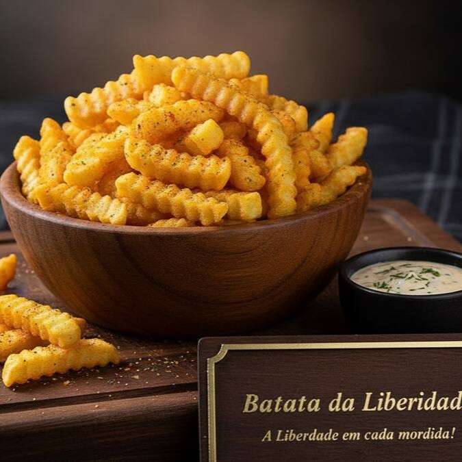 Nossas batatas são o verdadeiro sabor da autenticidade. Com cortes crinkle e o formato ondulado característico, mantemos a casca para garantir mais sabor e textura. Elas são fritas no ponto perfeito, resultando em uma crocância inigualável por fora e uma maciez por dentro. Para finalizar, recebem um banho do nosso mix secreto de temperos brasileiros, que as torna o acompanhamento ideal para o seu hambúrguer, celebrando a liberdade de sabores que só a Liberdade Burguer oferece.