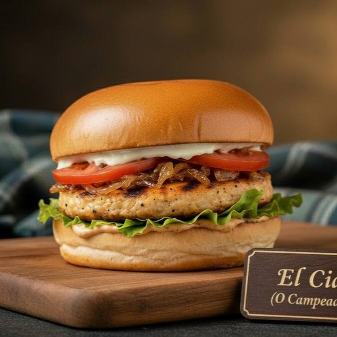 • Identidade: Este é o hambúrguer "não-tradicional", que quebra as regras com o frango, representando a estratégia e a liderança de El Cid. O frango grelhado e os vegetais são a "espada" que corta a monotonia.
