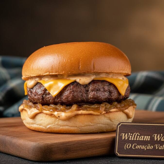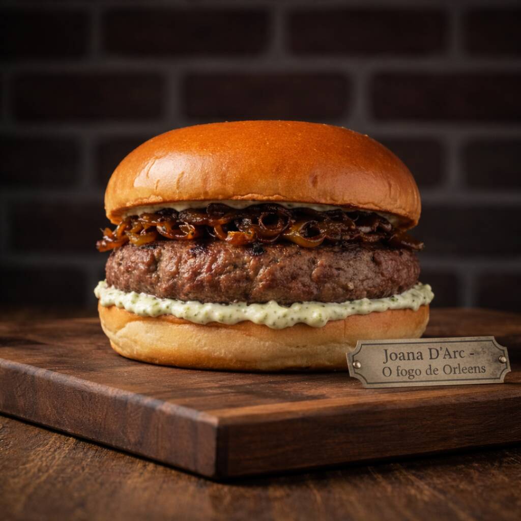 Pão brioche, suculento blend de carne de boi da casa (120g), Cream Cheese de Ervas Finas e cebola caramelizada. • Identidade: A alma francesa em um hambúrguer. Uma combinação de sabores clássicos com um toque de ousadia e nobreza, que representa a bravura de quem luta por sua liberdade.