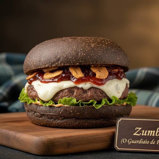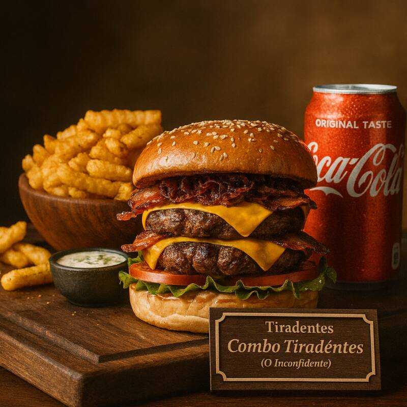 • Identidade: Este é o hambúrguer mais robusto, um verdadeiro "chefe" do cardápio. Ele representa a força e a rebeldia da Inconfidência Mineira.