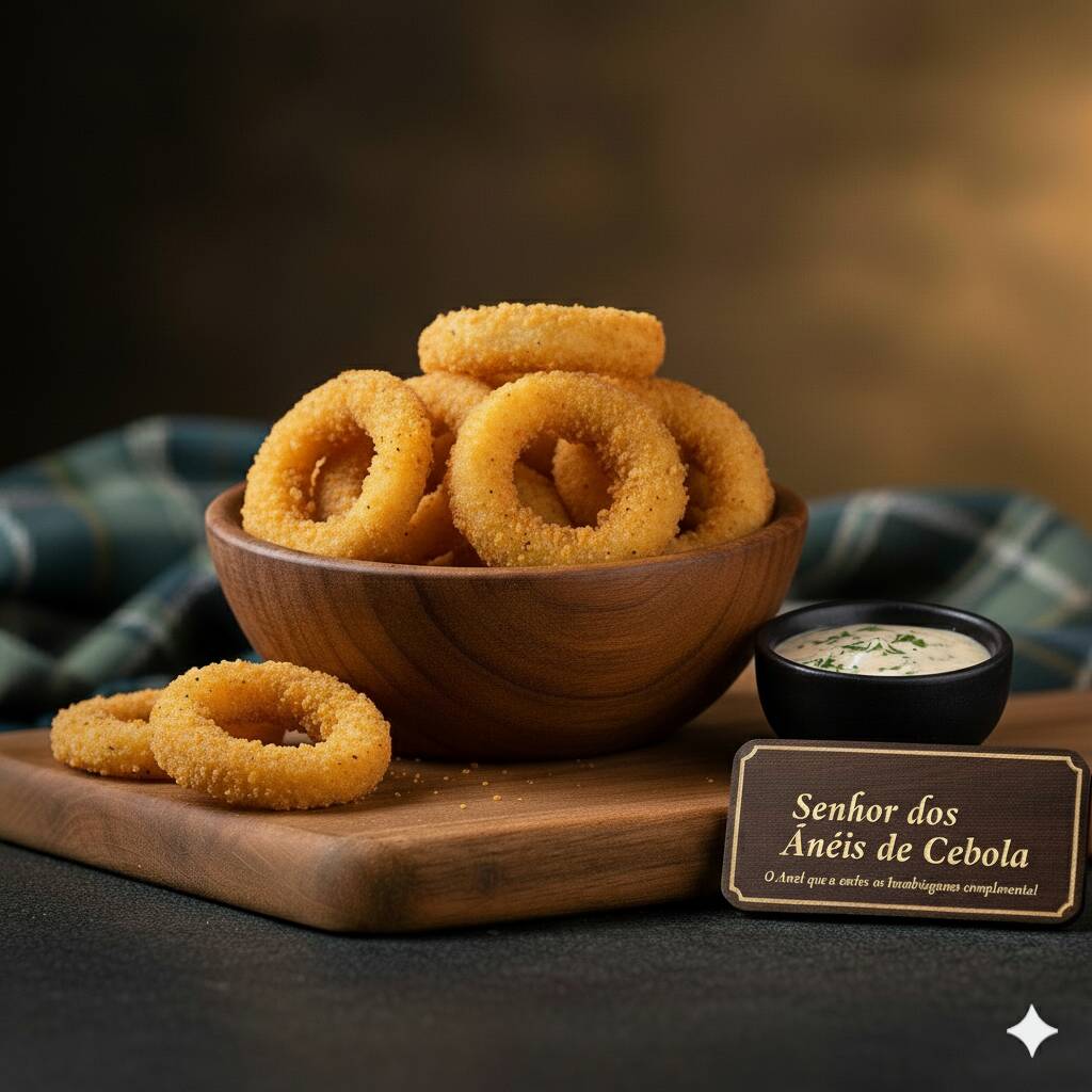 A lenda diz que um anel de cebola foi forjado, feito com a mais pura cebola dourada e uma camada crocante incomparável. É o Anel que a todos os hambúrgueres complementa, pois ele é o único capaz de trazer a harmonia perfeita ao seu lanche. Não há escuridão, nem sabor fraco, que resista ao seu poder.