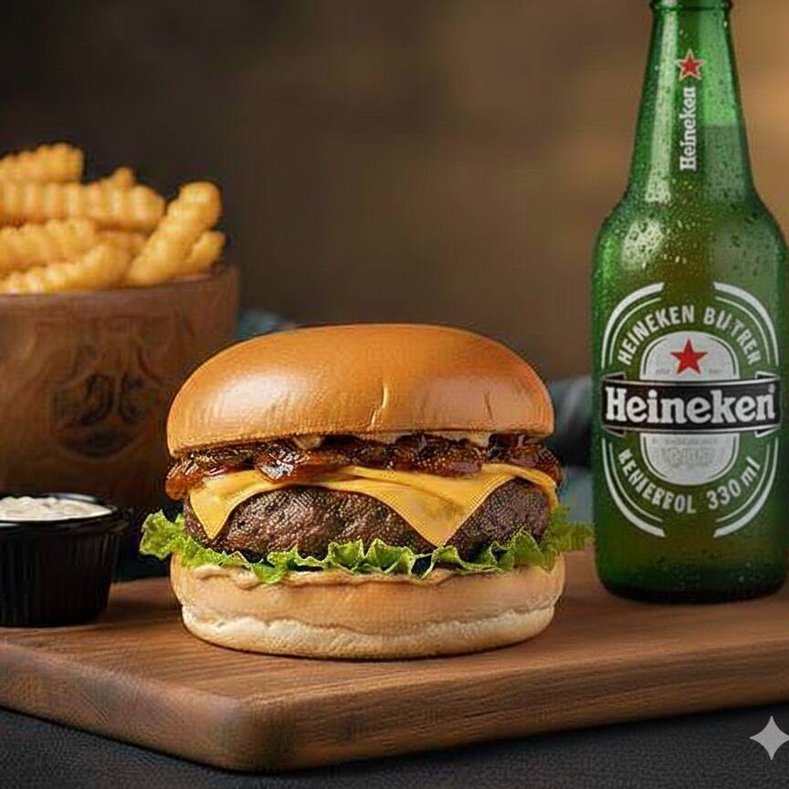 Hambúrguer 120g + Fritas + Heineken long neck 330ml