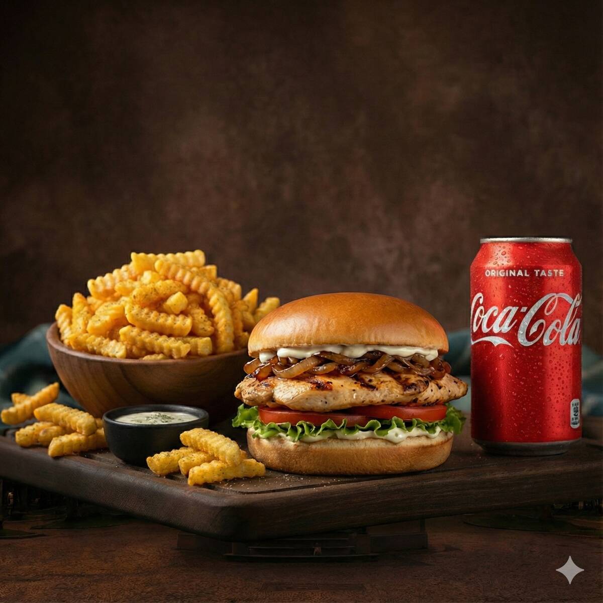 El Cid (Pão brioche, suculento blend de frango (120g), fresca alface americana, tomate, cebola caramelizada e o sabor irresistível do Catupiry) + Fritas + Refrigerante
