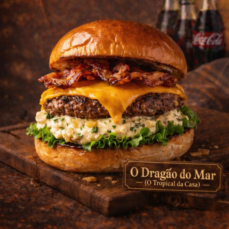 🍍 O Dragão do Mar (O Tropical da Casa) Um hambúrguer intenso e marcante, com personalidade única. Pão brioche macio, blend bovino suculento grelhado no ponto, coberto com cheddar cremoso derretido e bacon crocante. Finalizado com alface fresca e o grande destaque da casa: nossa maionese artesanal de abacaxi grelhado com hortelã, trazendo um toque tropical irresistível. 🔥 Uma combinação perfeita entre sabor defumado, cremosidade e frescor em cada mordida.