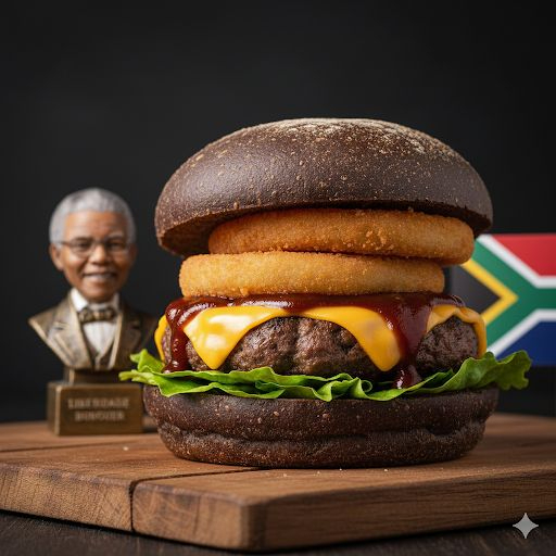 Nelson Mandela (O Pacificador) * Identidade: Inspirado no líder que uniu uma nação e derrubou as barreiras do preconceito. O pão australiano escuro e os anéis de cebola dourados representam a "Nação Arco-Íris", simbolizando a quebra das correntes do Apartheid e a harmonia entre diferentes cores e sabores. É um hambúrguer que celebra a resiliência e a vitória da liberdade sobre a opressão. * Descrição: Pão australiano macio, suculento blend da casa (120g), queijo cheddar derretido, alface americana sempre fresca e o toque defumado do molho barbecue. O grande destaque são os dois Onion Rings crocantes, posicionados estrategicamente para abraçar o sabor e representar os elos de união e liberdade.