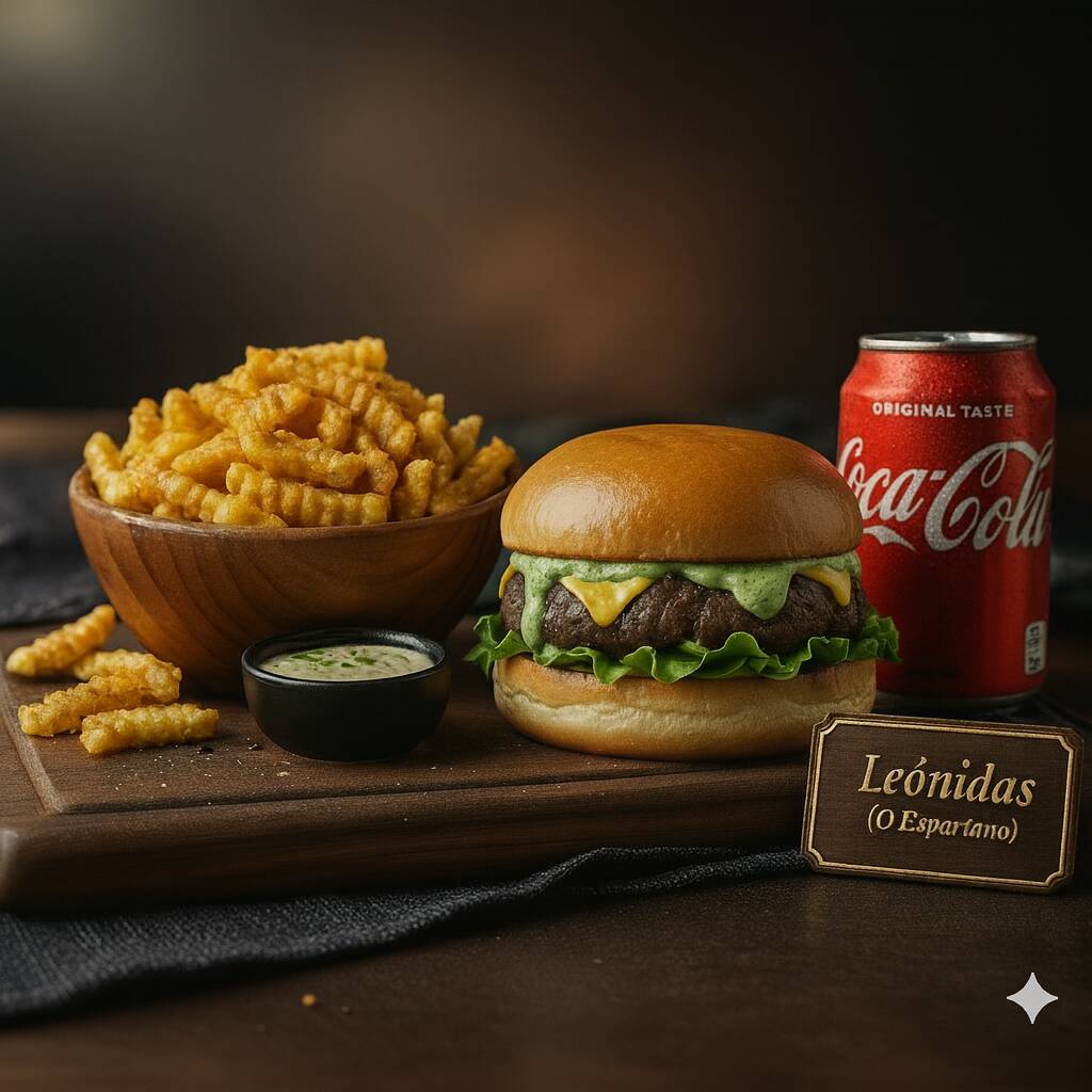 Leônidas (Pão brioche, suculento blend de carne de boi da casa (120g), queijo cheddar, fresca alface americana, e o toque especial do nosso molho verde) + Fritas + Refrigerante