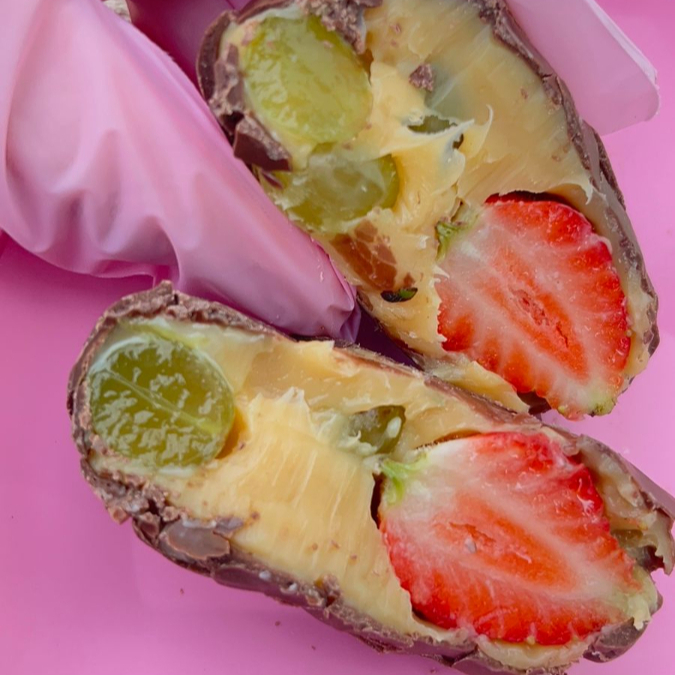 Recheio de ninho e 3 uvas verdes coberto com chocolate