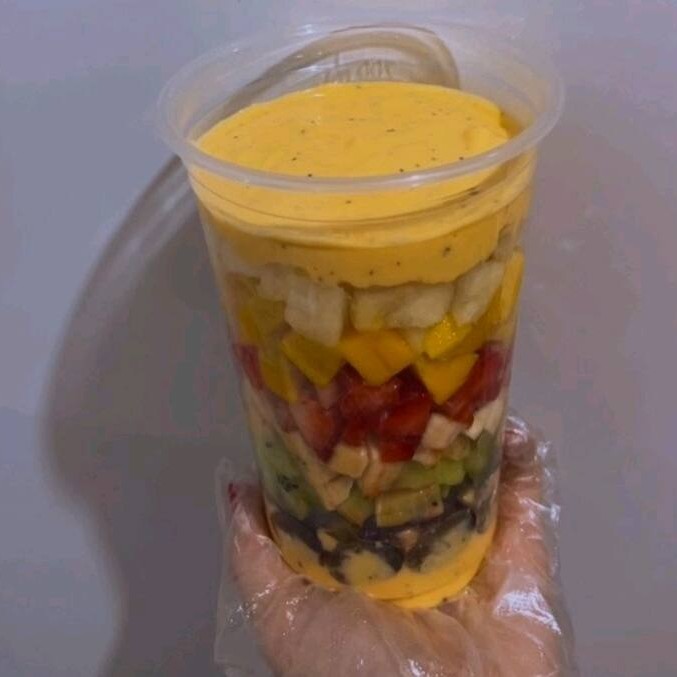 Banana, Uva, Kiwi, Morango, Abacaxi e Manga acompanhado de Mousse ou Leite Condensado.