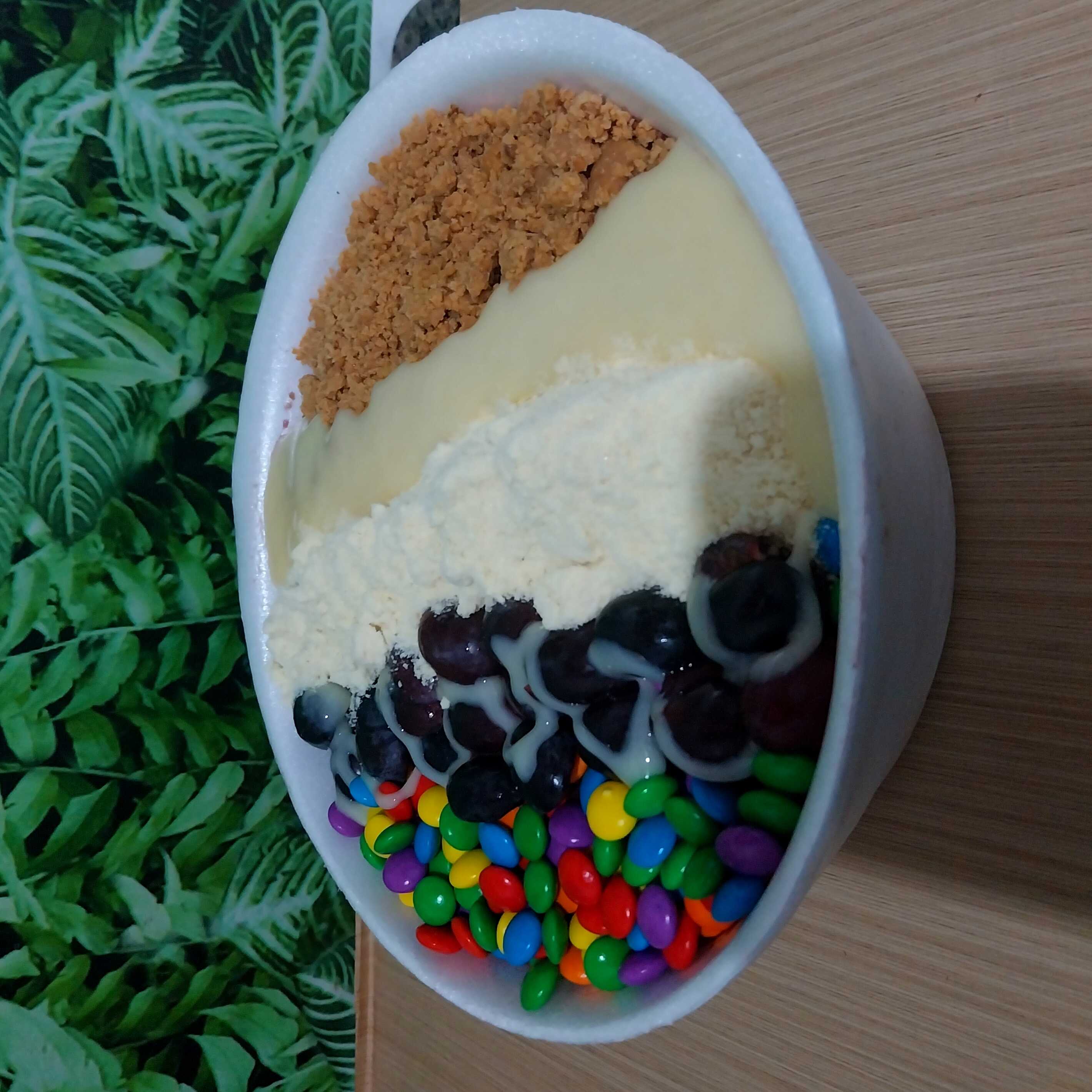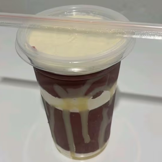 Batida com Amendoim, granola e banana + camadas de leite em pó.