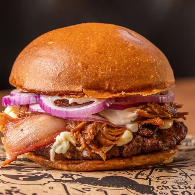 Pãozinho de batata tostado, blend de 160 gramas grelhado no fogo, Catupiry cremoso, costela bovina defumada e desfiada, fatias de cebola roxa, bacon defumado e maionese defumada.