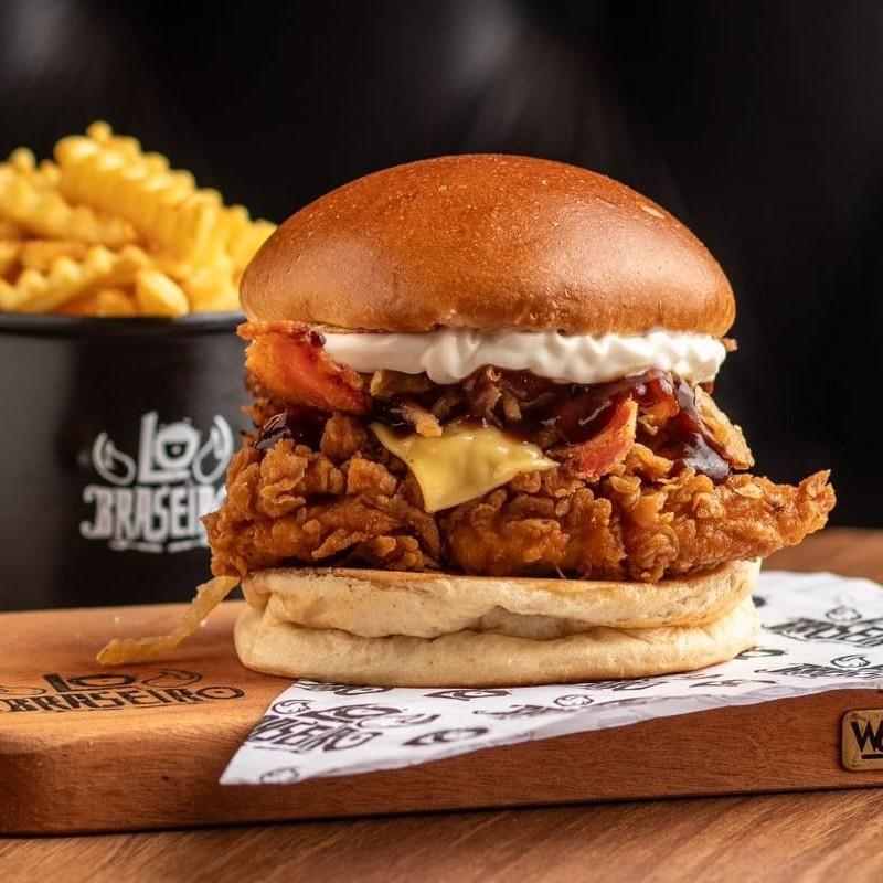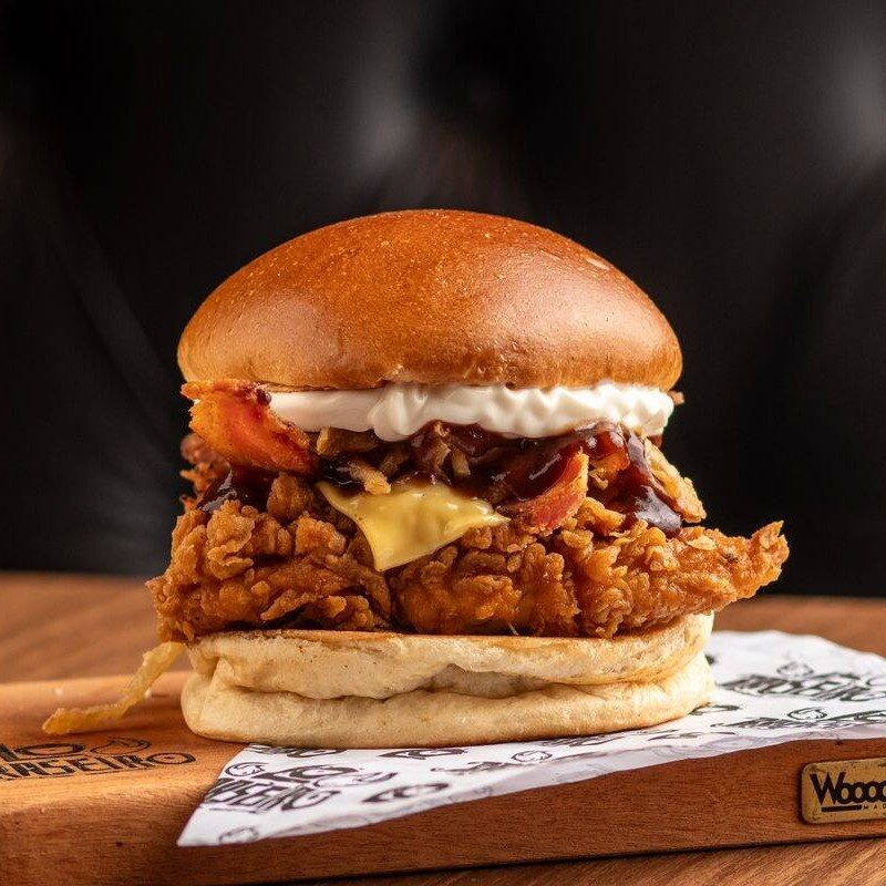 Tirinhas de frango empanado diretamente em nossa cozinha, fatia de queijo prato, fatias de bacon defumado, nossa incrível cebola crispy feita na casa, molho barbecue e tudo isso dentro de um pãozinho brioche artesanal e fofinho
