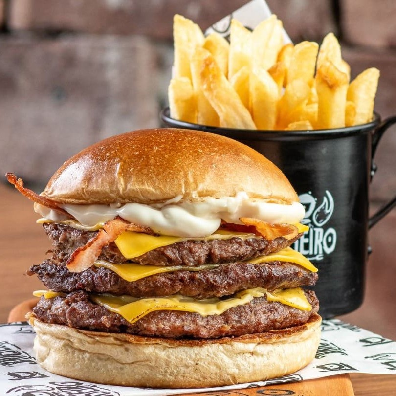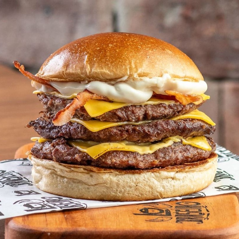 Pão de brioche selado, 3 blends de 100 gramas grelhado no fogo, triplo queijo prato, fatias de bacon e nossa deliciosa maionese defumada.