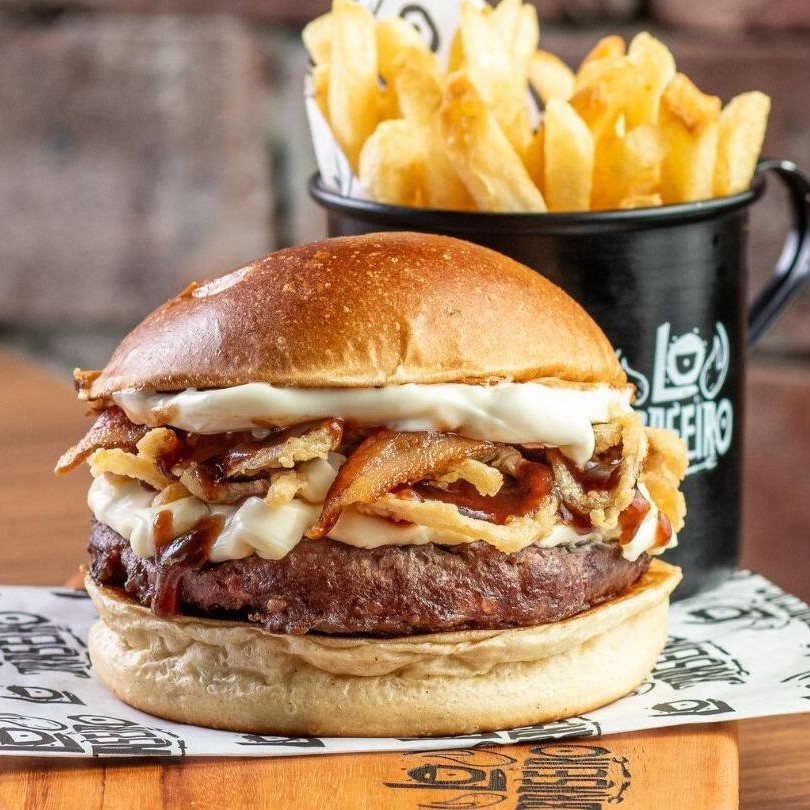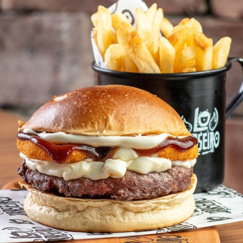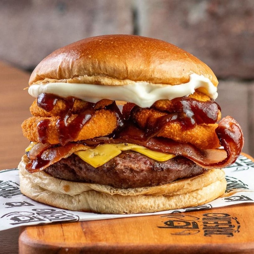 Pão de brioche selado, 01 blend de 160 gramas grelhado no fogo, Catupiry cremoso Original Catupiry, onion rings, Bbq e a nossa deliciosa maionese defumada.