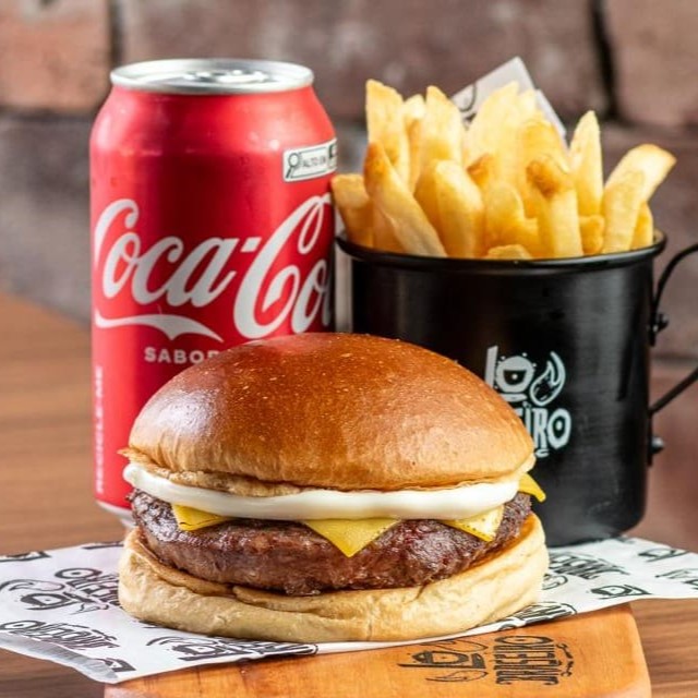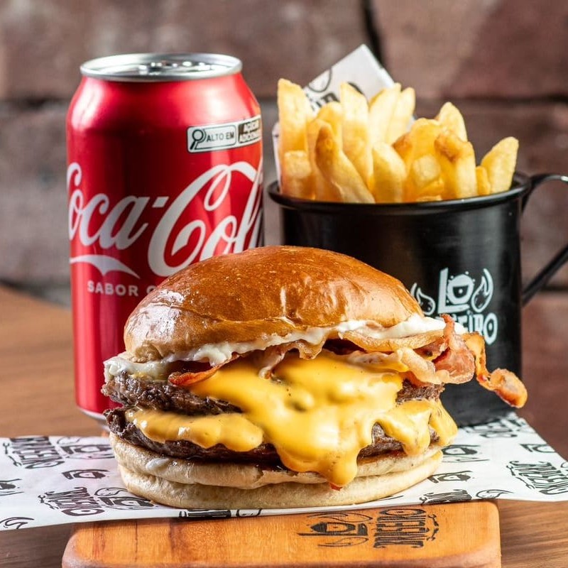 Pão de brioche selado, 2 blends de 100 gramas grelhado no fogo, cheddar cremoso feito na casa, fatias de bacon defumado e nossa deliciosa maionese defumada. Acompanha Fritas + Refrigerante Coca Cola 350ml