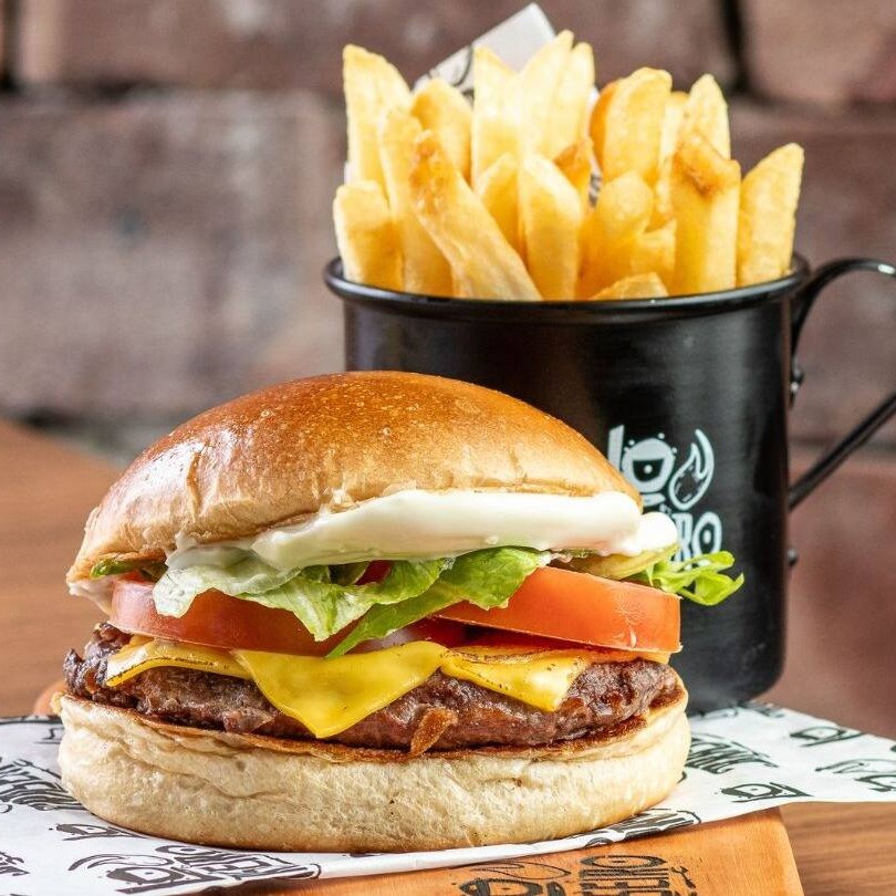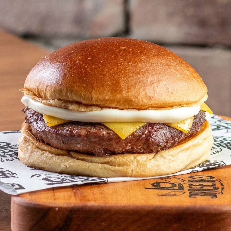 Pão de brioche tostado, burger de 160g na brasa, queijo prato e maionese defumada.