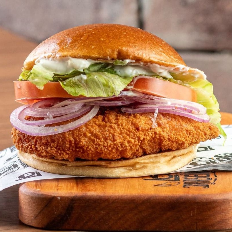 Pão de brioche tostado, tirinhas de frango empanado, tomate, alface americana, cebola roxa e nossa queridinha maionese defumada.